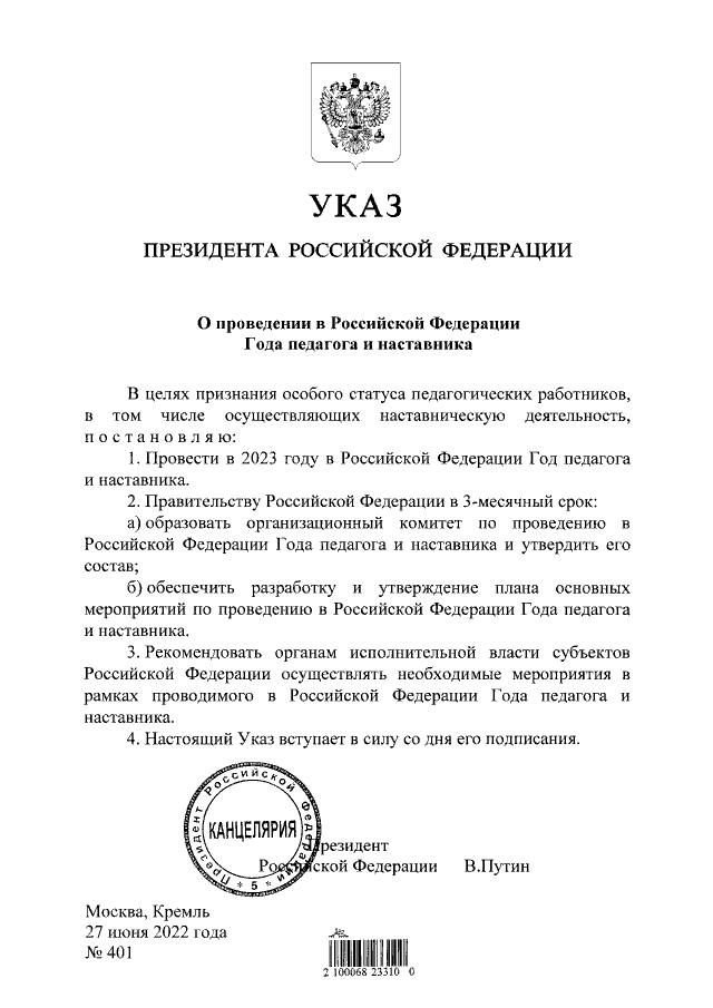 Глава государства подписал соответствующий указ, который опубликован на официальном портале правовой информации и вступил в силу со дня его подписания, 27 июня 2022 года. В документе сообщается, что Год педагога и наставника утверждён «в целях признания особого статуса педагогических работников, в том числе осуществляющих наставническую деятельность».